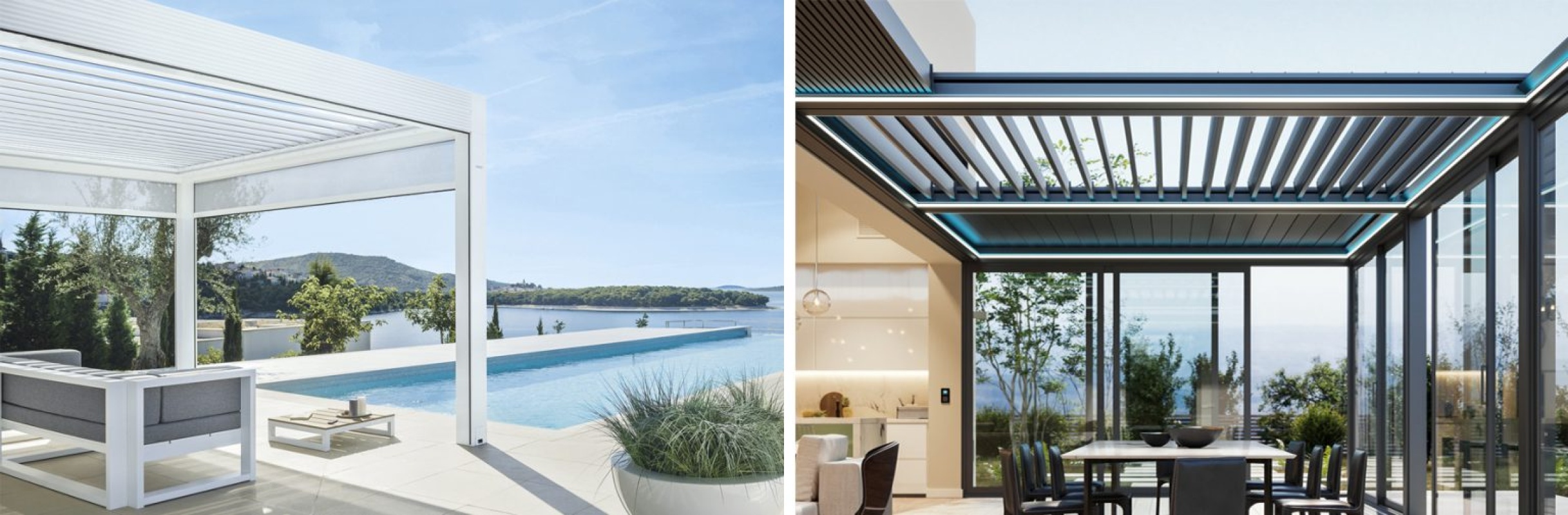 The bioclimatic adjustable pergolas have a system of aluminum slats that can be adjusted at different angles, allowing to regulate the amount of light and ventilation that enters the covered space.