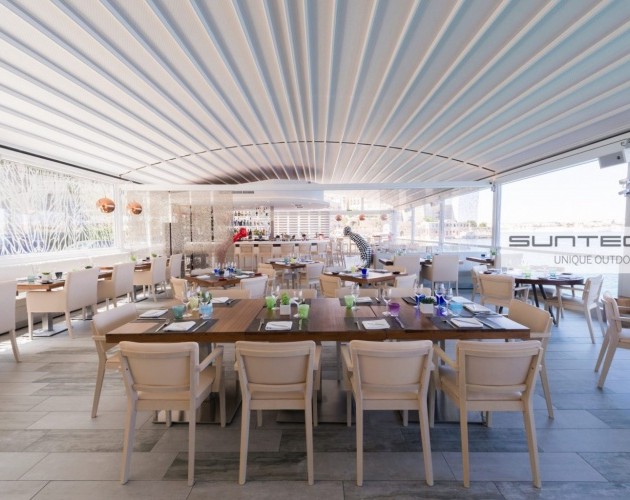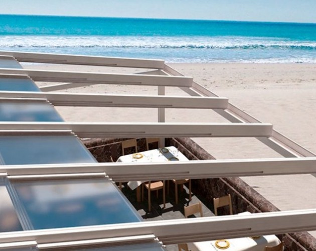 Las pérgolas tensadas o corredero técnico son también una base ideal para un cerramiento con cortinas de cristal o toldos verticales.