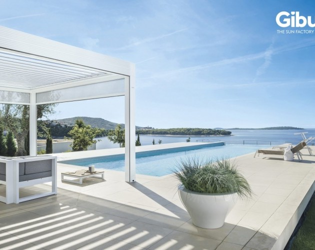 Las pérgolas bioclimáticas pueden llevar para-vientos de cristal o toldos verticales. Son una magnifica base para un cerramiento estanco y luminoso.